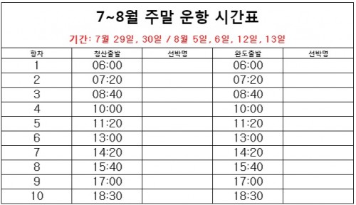 7,8월 성수기 주말 배 운항 시간표(완도-청산도)